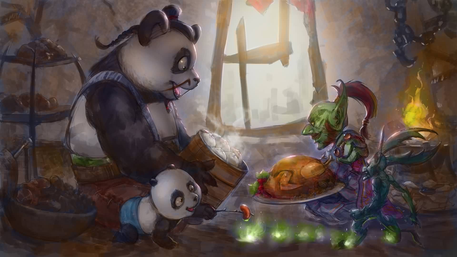 熊猫父子被女血精灵法师坑得倾家荡产后,在一位好心的兽人介绍下,在奥格瑞玛的伙房干活赚些饭钱。