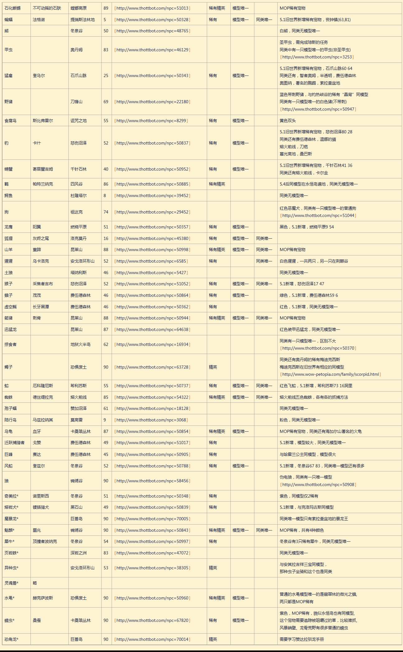 | 螃蟹 | 寄居蟹吉姆 | 千针石林 | 40 | [http://www.thottbot.com/npc=50952] | 稀有 | 模型唯一 | 5.1旧世界新增稀有宠物,千针石林41 36 同类还有熔火前线,卡尔金 |
