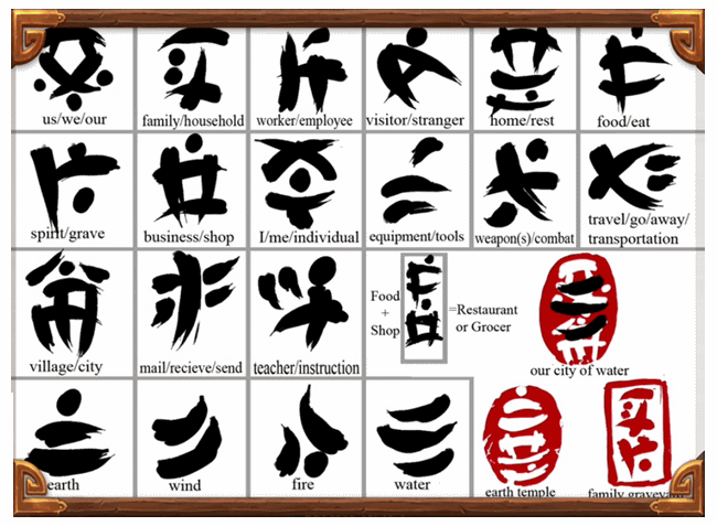 熊猫人语严格意义上来说并不是熊猫人自己的语言。根据故事,魔古曾经禁止熊猫人使用自己的语言,并烧毁熊猫人的文学著作。现在熊猫人说的其实就是魔古语,但可能会在个别词汇上有所差异。熊猫人语的一些词汇,毫不意外地来自汉语,以及汉语圈内的语言。从原声大碟中The Traveler’s Path一曲可以看出,歌词发音规则明显相似汉语,都是单音节的词。但开发者并不想要照搬现实中的语言,这样老外可能听上去可能很有中文的感觉,但我们中国人听起来就有点不伦不类。而下图中的熊猫人文字示例可以看到暴雪设计师对中国文化的理解可谓入木三分,结合了汉字规则和熊猫人用爪子书写的方式,虚构了一种不存在,但是却很合理的方块文字。