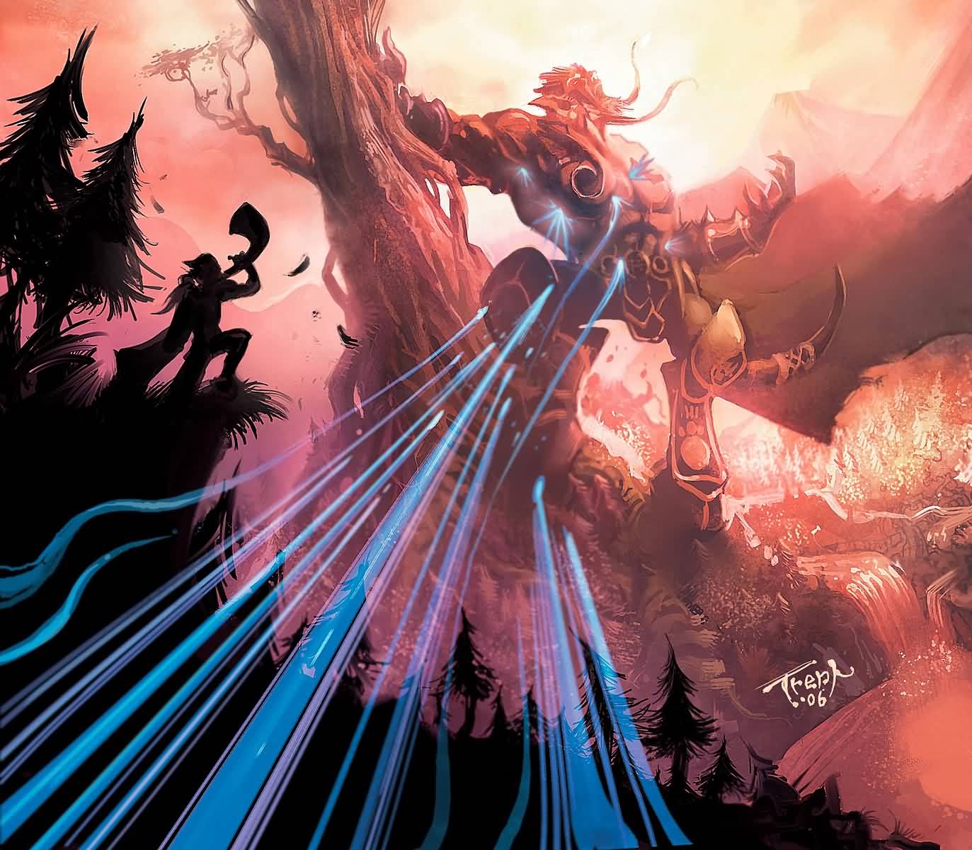此时,受到先知指引的各个种族已经拉开了与恶魔的多线作战。暗夜精灵、人类和兽人还有卡利姆多的土著生物第一次放下了彼此的矛盾,齐心协力抵抗恶魔的侵略。在阿克蒙德进军海加尔山的战斗中,兽人、人类与精灵组成了三道防线延缓恶魔和亡灵军团进军的脚步,为玛法里奥争取时间。正当阿克蒙德终于抵达世界之树,准备吸收他梦寐以求的强大力量时,早已准备好的玛法里奥呼唤无数小精灵,引发巨大的爆炸,将污染者置于死地。我们后来通过时光之穴回顾海加尔山战役,再次看到的那次令人难以忘却的经典之战——诸神的黄昏。