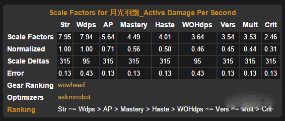 结论:主手武器DPS = 力量 > AP > 精通 > 副手武器DPS = 溅射 = 全能 > 暴击
