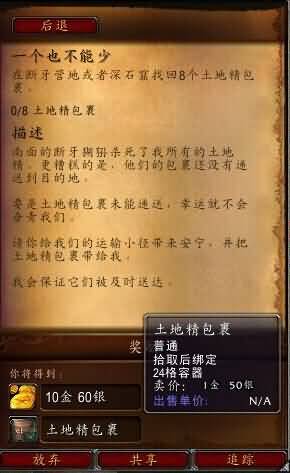 [土地精包裹]昆莱山 酒坛集 58.1 61.4 NPC<堂弟皮棉兜> 背包起始任务 [(88) 粗麻小径:前往粗麻驿站] 然后护送土地精到达粗麻驿站 [(88) 兔子脚] [(88) 断牙猢狲的破坏] [(88) 一个也不能少] 做完这个任务包包就到手了。