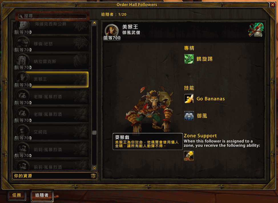 7.0职业大厅的追随者除了可以指派完成一些追随者任务之外,某些追随者还拥有协助玩家在野外战斗的功能。