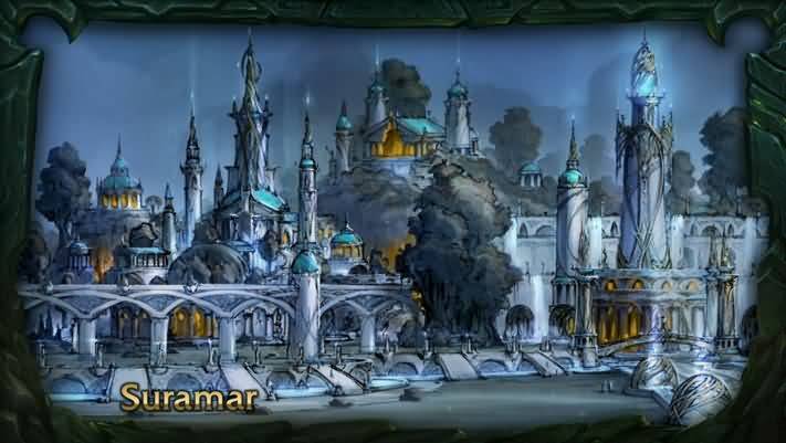 苏拉玛城在上古史暗夜精灵的一座巨大城邦。在苏拉玛居住的暗夜精灵信奉着艾露恩月亮女神,他们大多都是艾露恩的修女团和作为月神代表的大祭司,毫无疑问这里是暗夜精灵曾经的宗教信仰中心。当然苏拉玛也是个英雄辈出的城市,怒风兄弟,泰兰德,影歌姐弟都出身于此,还有小说当中提到的珊蒂斯.羽月。而在上古之战中又是苏拉玛城率先开始了抵抗燃烧军团的征程,玛法里奥通过翡翠梦境得知了女王艾萨拉的背叛,于是提前组织的苏拉玛的城防,最后当永恒之井爆炸之后,苏拉玛也沉入了海底。我们在冰封王座中看到马维追踪伊利丹到了破碎群岛后,那个从海底升上来得城市就是曾经的苏拉玛城,在最新的7.0资料片预告中我们也了解到在苏拉玛的暗夜精灵利用泰坦的神器关闭了恶魔传送门后便利用阿曼苏尔之眼(创世之柱之一)的能量建造了一个巨大的秘法池,后来被称为暗夜井。井水滋养着这些上层精灵魔法师,保护他们免受将来的威胁。数千年以来,井水改变了伊莉森德和他的盟友,将他们转变沉了新的种族夜之子精灵。