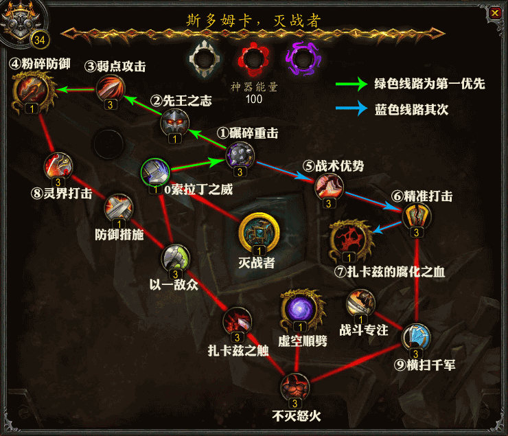 蓝色路线:最终的大特质“扎卡兹的腐化之血”强化爆发/AOE能力,不过武器战的爆发AOE就算不要这个大特质也已经足够,远不及"粉碎防御"带来的单体DPS提升,所以为第二优先级。这两个大特质出了之后的选择余地就非常多了,看需求点就好了,第三个大特质"虚空顺劈"强化的是持续AOE能力,不过武器战向来不擅长持续AOE,可以最后点出。