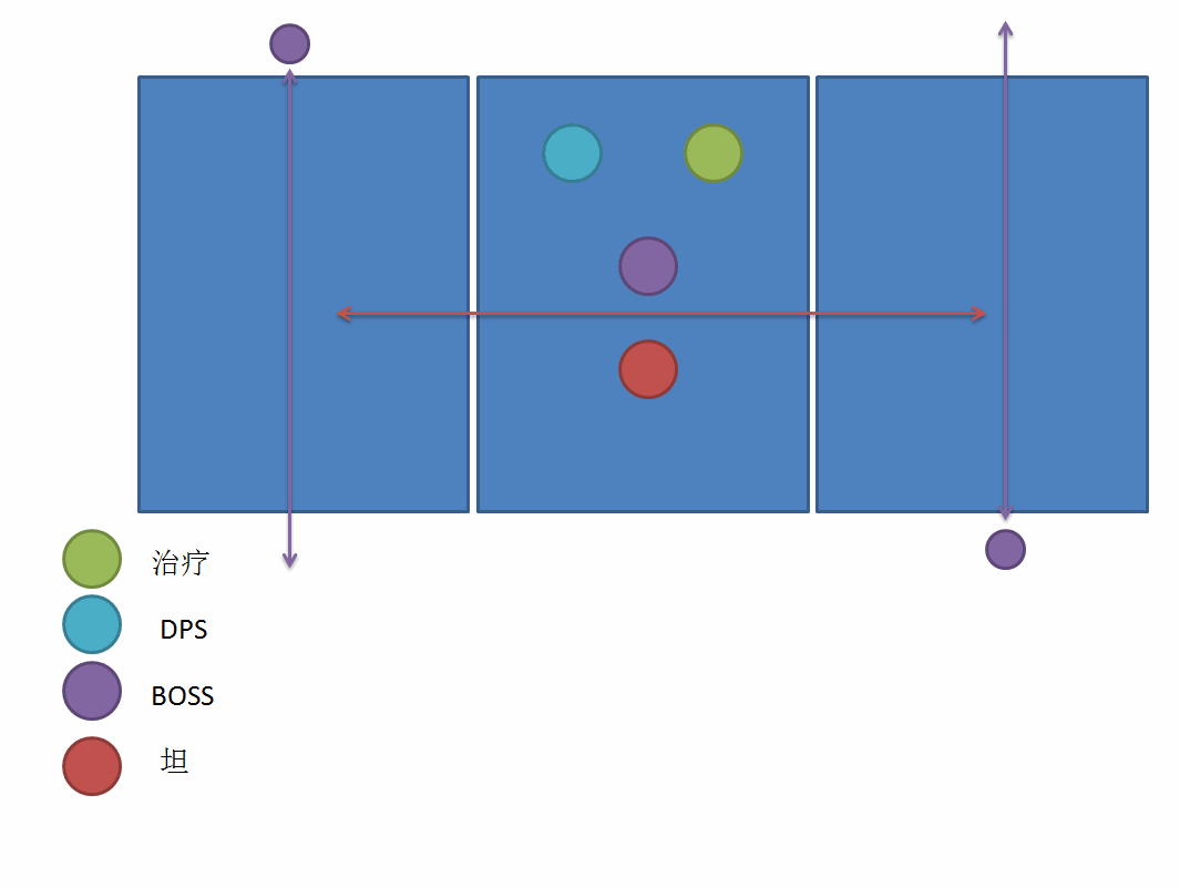 站位如下,BOSS有两个阶段。请在开场之前看好左右两个怪的位置。