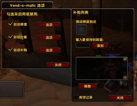 VendOmatic自动出售修理和补购插件,访问NPC时自动修理(支持公会资金),自动出售垃圾(可自定义不要出售的)和自动补购施法材料。