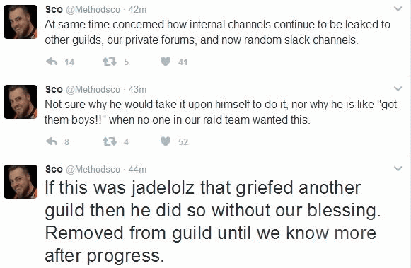 Method会长Sco发推解释此时与Method公会无关,并将此账号已经踢出公会,待开荒结束后处理。不过Serenity公会主力坦克Slooty发推表示,该成员是授意与Method公会才做出此次窃取ID事件的。
