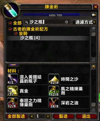 沙之瓶的材料如下: (市价为巨龙之喉拍卖场所示)