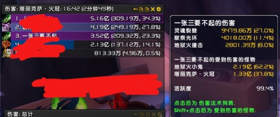 关于天赋,目前基本就两种大流派,一种破裂炸弹流,一种喂食裂劈流。前者技能产怒,破裂耗怒产球,炸弹耗球,后者技能产怒,裂劈耗怒,裂劈(或者炸弹)耗球。破裂炸弹在尖刺覆盖率上肯定是不如喂食裂劈流的,所以前者对尖刺的有效覆盖相当有要求,尖刺覆盖的时机要得当,一般选择在没痛苦使者,厚皮,变身烙印覆盖,怪物活跃期,所以需要监控的东西比较多,也就是尽量避免打脸。而后者尖刺的使用率高,痛苦使者覆盖率低。前者适合魔法伤害为主,不需要尖刺高覆盖的环境,后者万金油。我更推荐后者,因为不需要监控太多东西,毕竟越抠脚越好,也越能关注其他东西,比如boss时间轴,辅助指挥等等。关于伤害,两者流派到底谁高呢?虽然wcl上大多数是破裂流派,而且绝大多数也认为破裂炸弹可能更高,我个人也不怎么关注也不会上传wcl,我也拿自己喂食裂劈流的几次数据跟wcl对比过,差距并不是很大,我个人认为破裂炸弹被砍了几次后,伤害的优势已经没那么大了,举个例子裂魂x4+献祭×1+破裂x2+炸弹,两个循环16个gcd造成了8个裂魂,4个破裂单体伤害,2个献祭,2个炸弹aoe伤害,而喂食裂劈流16个gcd,可以算为11个裂魂,2个献祭13个gcd总计150怒,3个gcd打3个50怒裂劈,造成了11个裂魂单体伤害,2个献祭,3个50怒裂劈及奋发之魂的aoe伤害。所以16个gcd,不考虑尖刺怒气消耗,就是3个裂魂,3个50怒裂劈及奋发之魂对比4个破裂以及2个5球炸弹的伤害对比。通过上面的对比以及我自己常用的喂食裂劈流对比wcl破裂炸弹流,单体或者怪物较少(分散不在正面,裂劈的aoe只有正前方)破裂炸弹流略有优势。怪物越多,裂劈流的伤害优势越大。放一张上周20群星老2的输出图,wcl破裂炸弹流180万上下。
