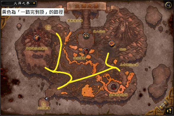 打法:先说明一下,腐化之路(地图左上角有传送门的那条路)、贝丝堤拉克巢穴(往蜘蛛王那条路)、火焰裂层(副本门口那条)、上古烈焰山脊(左右脚那条路)、碎石(火鸟场地),这边的顺序已经整理过分别是左上、左中、左下、右下、右中,上面的地图有注解过。