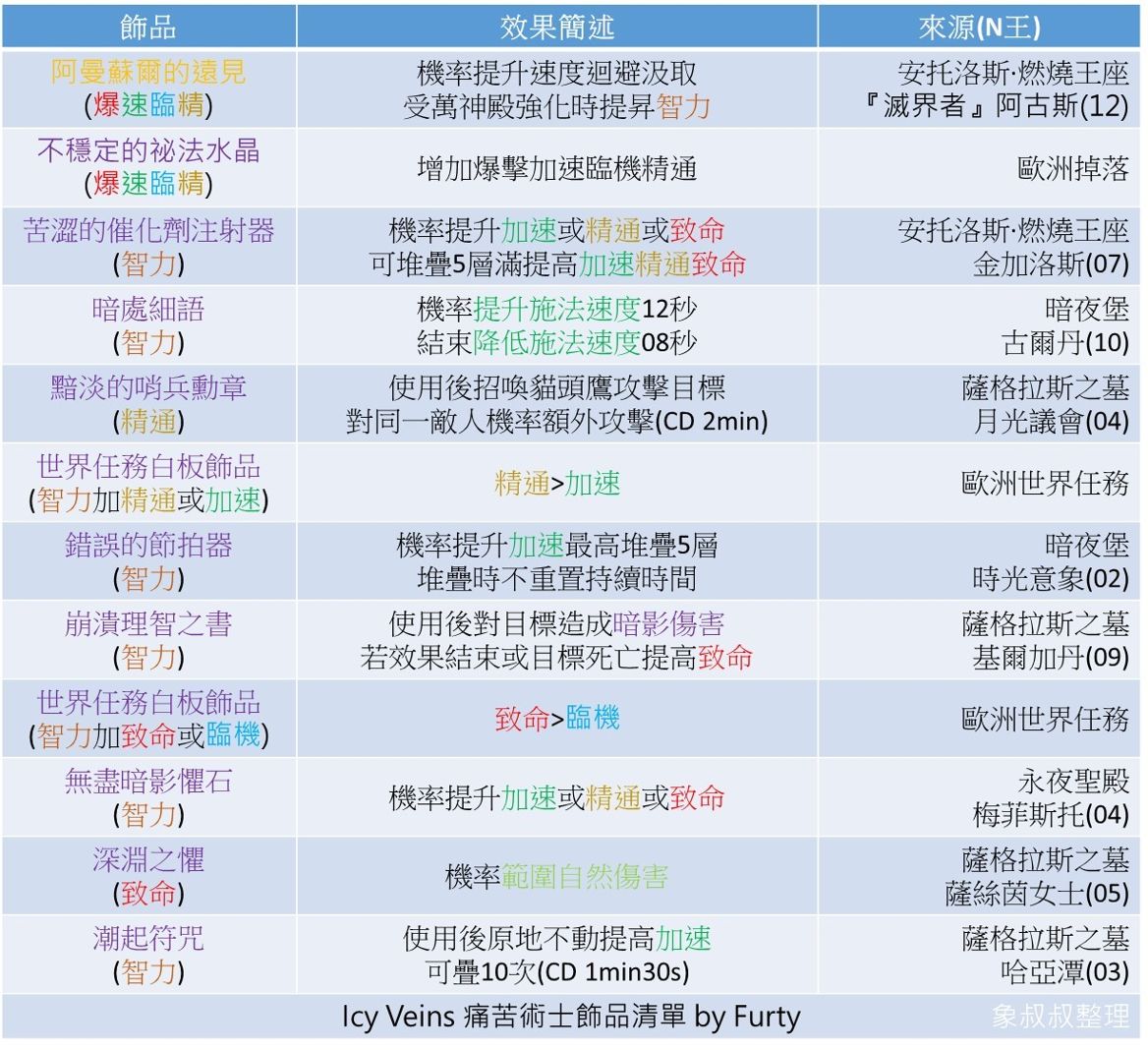 各种拓荒专用好朋友项链,和神人秒断法赛咪咪戒指,当然,随着各种M+掉落,泰坦造物的存在,底下表格内的BIS也仅仅是个参考