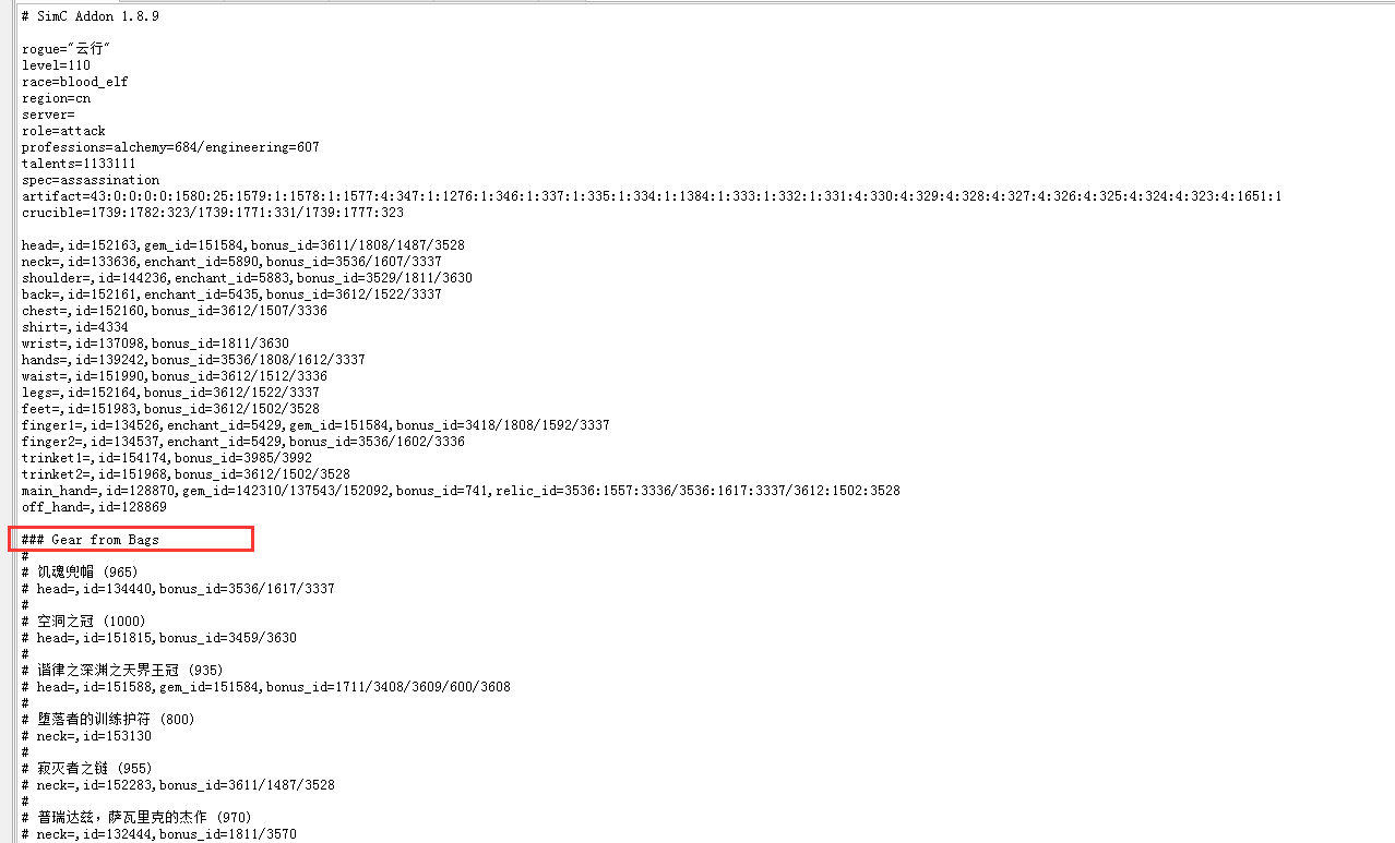 3. 在“### Gear from Bags”中,找到你需要进行对比的装备代码