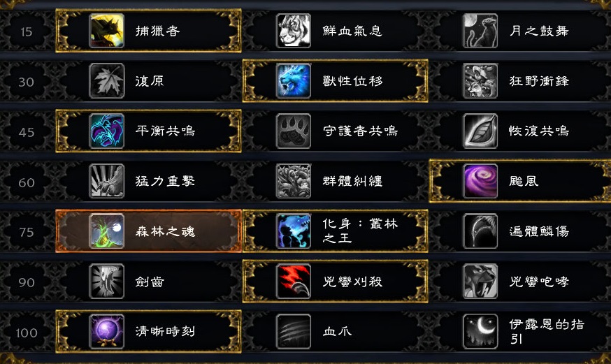 血爪 过去的血爪十分强力,50%的增伤可以让你的流血技能质量极高,但是目前被砍到剩下20%,遍体鳞伤也被nerf,在化身期间使用愈合又是一个相当浪费GCD的动作,这也是为什么目前血爪非常少人使用,一般我们只会在长时间有双目标的时候才会用到。