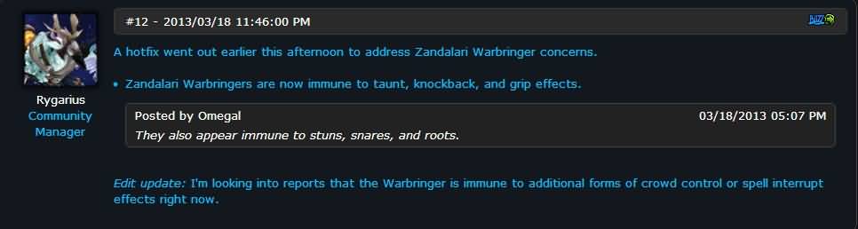 “关于赞达拉战争使者的问题会有一个hotfix进行修正:赞达拉战争使者将免疫嘲讽、击退以及死亡之握效果。”