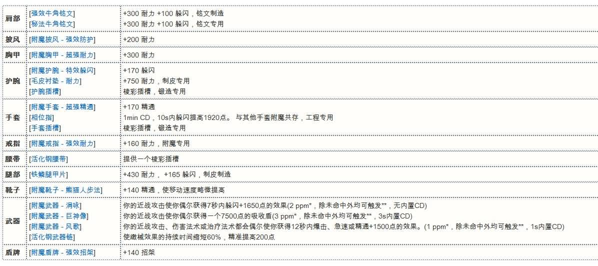 由于属性系统被重做,大多之前的附魔也跟着被重做了。我将在下面介绍防骑适用的附魔,你应该根据你所选择的重铸策略来选择附魔: