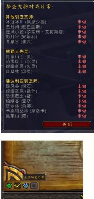 宠物战斗日常插件Battle Pet Daily Tamer + DailyTamerCheck,Battle Pet Daily Tamer会为你在地图上标出这些宠物对战日常的位置。DailyTamerCheck可以查看当前可以做的宠物日常。在聊天框内输入/dtc查看当前宠物对战日常状态;打开大地图,左下角勾选宠物对战显示类型。