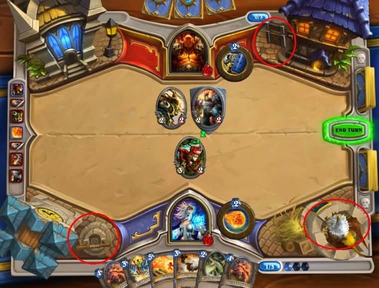 我相信炉石传说给人最耳目一新的第一印象绝对是它在四个角落的场景设计,以各个主城的地标作布局,完美契合了炉石这个旅馆绑定的概念。更甚的是每个 设计都可以“互动”!!——如果你注意看目前的三个视频,就会发现鼠标可以用来开关酒吧的门、摇晃水井的桶……在多次点击后甚至可以产生变化(如把酒吧的 招牌弄坏),更甚者——当鼠标移动到狮鹫的眼前,狮鹫的头会追随鼠标然后去啄!!