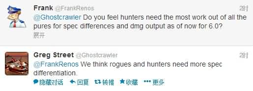 锁甲双废之一的猎人也许不用再那么“废”啦!近日有玩家在推特上询问魔兽世界首席系统设计师鬼蟹,是否认为在6.0时需要对猎人花费更多的精力,以及在伤害输出上做出一定的调整呢?鬼蟹对此表示肯定。但他认为有必要让猎人和盗贼在天赋专精上体现出一点儿不同。