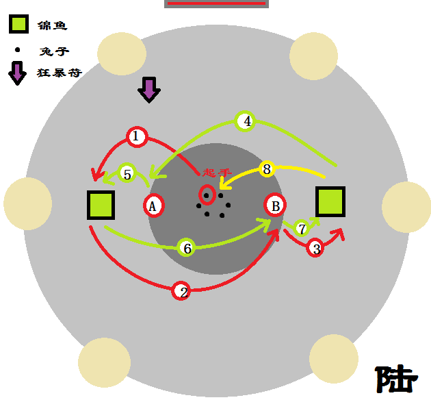 图示略复杂,其实就是不断地跑位打割裂毒药耗血,DPS压力很大。A、B为两个站位,目的为了给兔子群和锦鱼人刀扇。频繁给兔子刀扇作用是让兔子保持低血量,让无法打断的锦鱼人给兔子加血。
