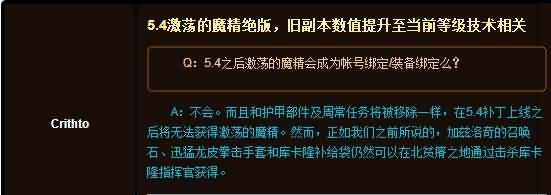 之前我们看了关于5.4激荡的魔精将绝版的蓝贴(如下),不过也有很多人表示不希望这些有趣的物品彻底消失,对此发言人Crithto又给出了最新的解释: