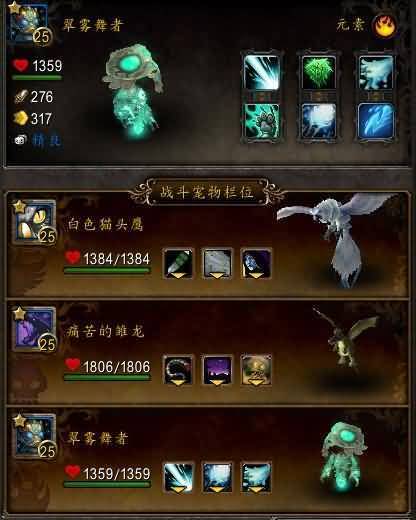 在属性上,翠雾舞者的元素属性可以克制机械,元素攻击可以克制同类元素,但比较害怕水系宠物。而作为拥有飞行系攻击的猫头鹰可以克制水系宠物,协防元素。猫头鹰作为全飞行攻击的宠物遇到龙类宠物比较吃亏,所以要依靠痛苦雏龙的亡灵属性以及召唤黑夜和酸性吐息双人形技能来补充。除此之外痛苦雏龙的龙类攻击对于既克制水系攻击又克制飞行宠物的魔法宠物威胁巨大,可以相互协防。而猫头鹰作为飞行宠物又可以克制痛苦雏龙双人形技能比较头痛的野兽宠物。