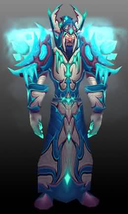 霜火的名字来源于法师可以选择的两个天赋(那个时候霜火箭还没有加入游戏),全身采用冰蓝色的设计,肩膀由悬浮着的冰块组成,并不断向外散发寒气。我个人认为法师T3的染色比起T7来说更加漂亮,事实上每个职业T3的原始设计都比T7重新着色后的造型要来得更赞。