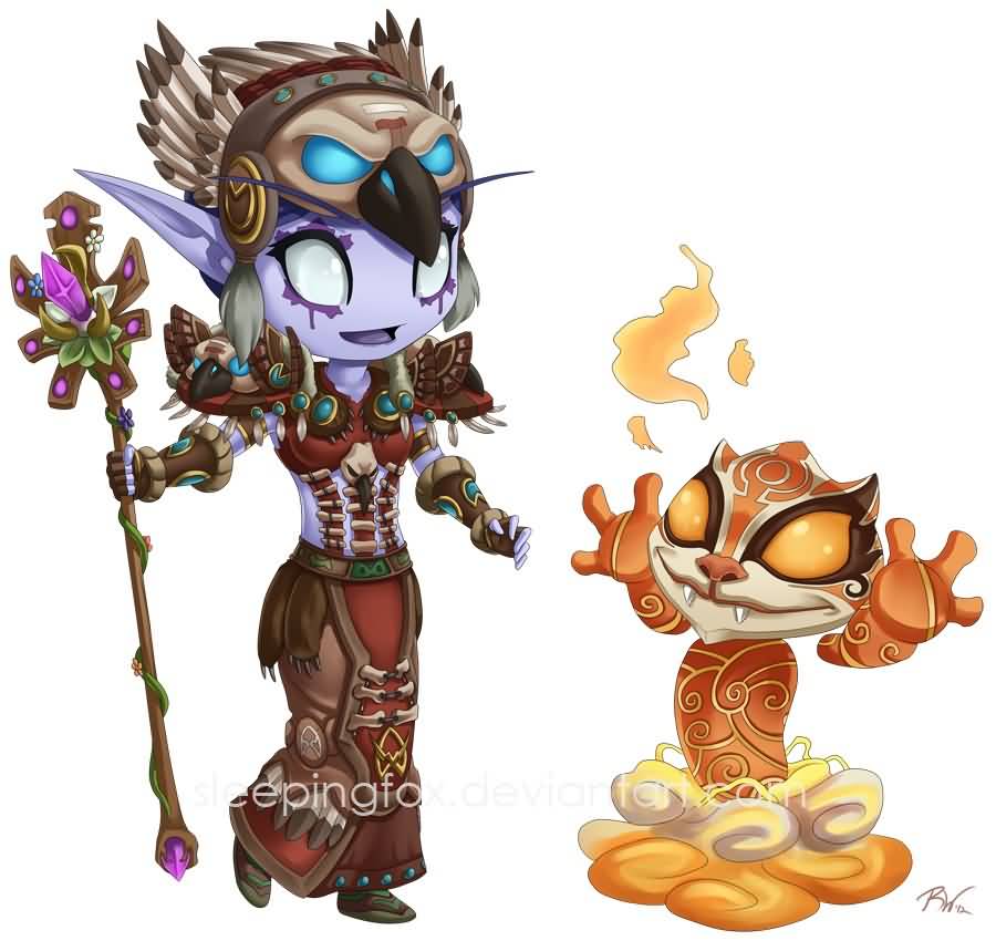 图片介绍:美国女玩家SleepingFox(沉睡的小狐狸)为她与朋友们的《魔兽世界》角色创作了30幅萌版插画。这些作品以暗夜精灵、德莱尼及血精灵女性角色居多,卡通化的人物形象乖巧可爱,又个性十足,萌得恰到好处。