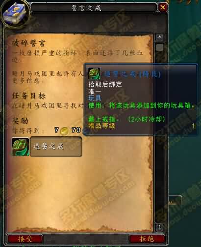 之前可能有玩家注意过这个玩具,写的是暗月马戏团的一个任务获取的,但是一直都没找到在哪里接。这就是重点了,玩家需要在指定位置击杀NPC,才能获取到这个任务物品,从而接到任务。