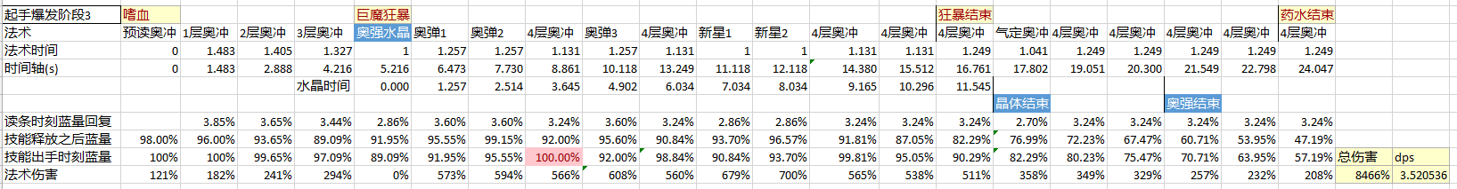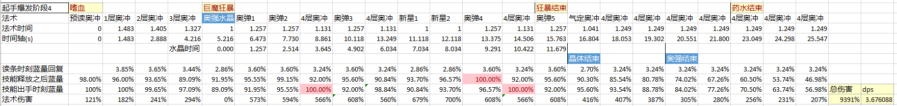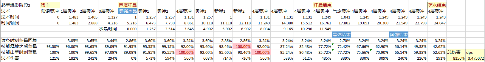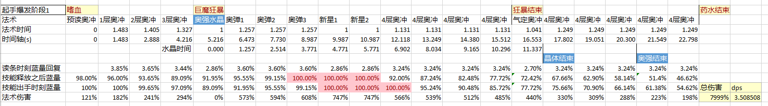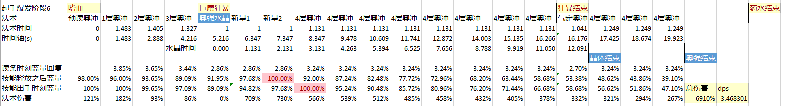 写这个文章的主要动因是想仔细分析爆发期的每一个细节,因此我用表格做了以下的时间轴,从起手预读药水直到40%蓝左右开始唤醒。