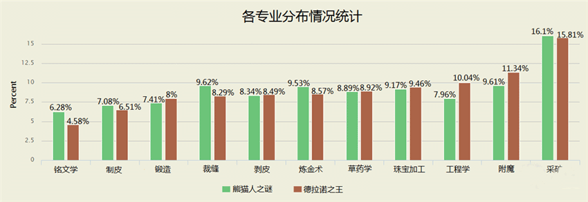 从下图中可以看到,魔兽世界中的11个专业分布情况并没有因为资料片的更替而出现大幅度的变化。从人数增减的角度来看,铭文、制皮、裁缝、炼金术这四个专业的学习人数出现了一定程度的下滑,学习其余7个专业的角色数量则有不同程度的增加;三大采集专业中的采矿以15.81%的比例占据第一,成为了学习人数最多的专业,而铭文学则4.58%的超低比例成为了所有专业中学习人数最少的专业。