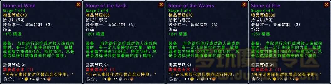同其他专业制作的装备不同,风之石属于拾取绑定的炼金专属装备,相同的是一样有4个不同装等级别。(6.1所有专业装备均有4个装等)