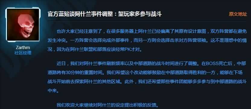 蓝贴谈阿什兰事件调整:望玩家多参与战斗