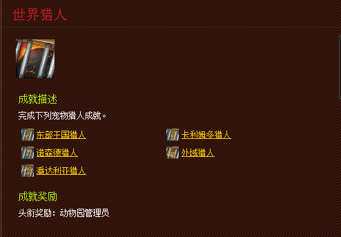 而卡利姆多猎人是[世界猎人]成就的一部分,这个成就奖励头衔:动物园管理员。