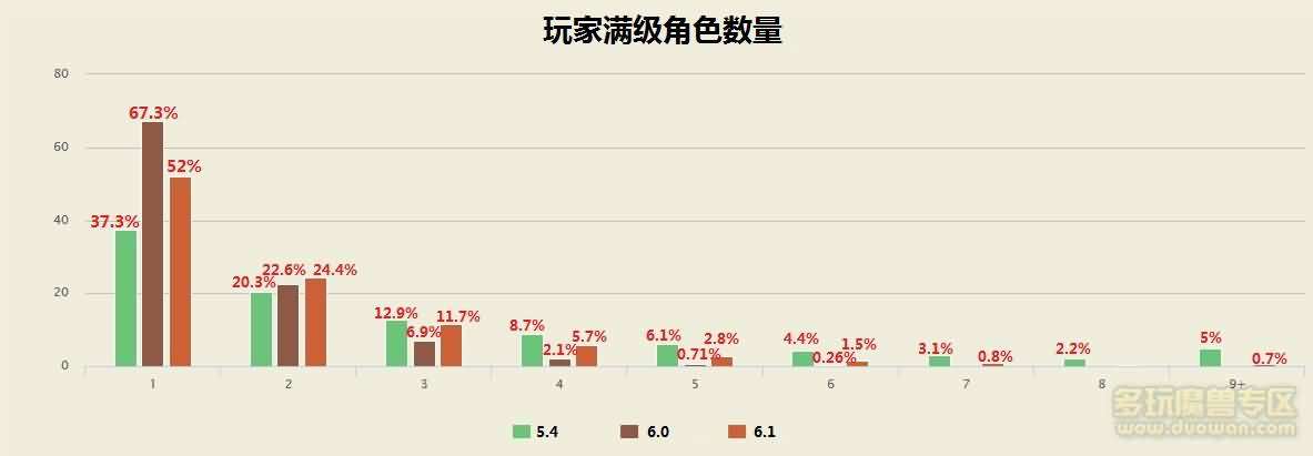 此外,今天一同汇总的数据还有玩家的单账号满级角色数量。6.0时期,拥有至少1个满级角色的玩家占总比例67.3%,6.1后则为52%