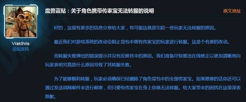 为了能够顺利转服,玩家必须确保已经删除了角色背包中的全部传家宝。如果愿意的话你还可以通过发送战网邮件来进行邮寄,但只要有传家宝在身上你就无法转服。给大家带来的困扰在这里深表抱歉。