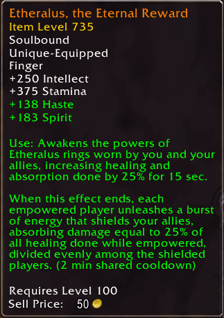 治疗:唤醒你和你的同伴所佩戴的Etheralus戒指的能量,治疗效果和吸收效果提高25%,持续15秒。效果结束时,每个被强化的玩家施放一道能量冲击,为同伴施加护盾,吸收相当于被强化时产生的所有治疗效果的25%的伤害,由获得护盾的同伴平均分担(2分钟共享冷却)。