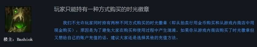 我们不允许玩家同时持有两种不同方式购买的时光徽章(即从拍卖行用金币购买和从游戏内商店中用现金购买),原因是为了避免大家在购买和使用过程中产生混淆。如果你从游戏内商店购买了时光徽章但又想给自己的账户充值的话,建议大家还是选择其他的充值方法。