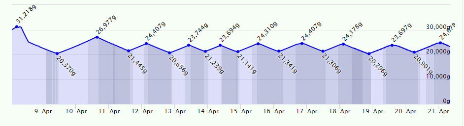 早在4月7日时,时光徽章已率先于美服上线,初始定价为30000金,上线后价格一直保持下滑,不过现在的价格已经稳定了,一直保持在平均22000金的水平(日均上下浮动2000金左右)。