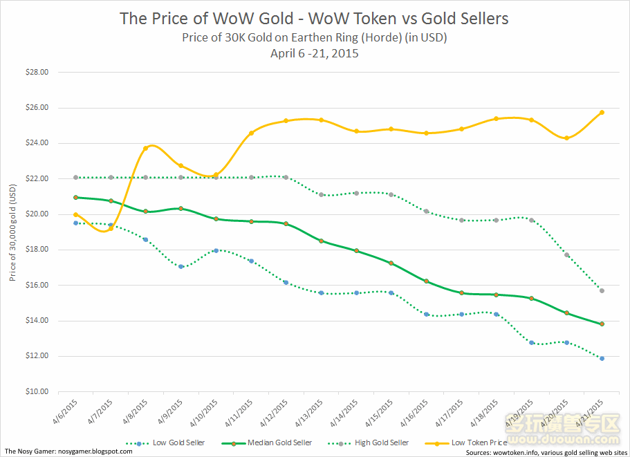 以前我曾分析过EVE公司CCP与第3方现金交易的抗衡。其中我表示该公司对EVE的飞行员执照的处理方式可以使得第3方交易平台毫无利润可言。随着时光徽章的引入,卖金者现在必须与暴雪的"官方金币"进行竞争。进一步来看,作为第3方金币卖家,他们必须给予买家更大的优惠来平衡黑金风险(封号)。这里可以看看大地之环服务器部落阵营的金价走势。
