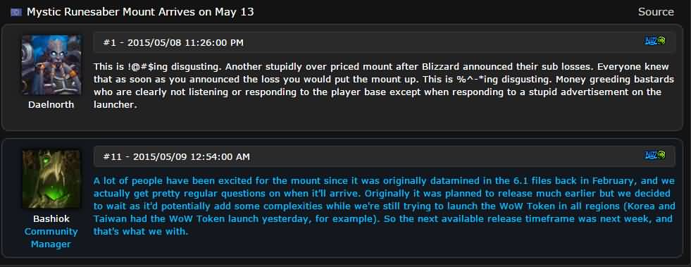 有玩家在官网论坛表示:你们这帮贪婪的家伙,在一发布财报宣布付费用户流失的时候,就高价开卖坐骑,简直是太恶心了,你们不听玩家的反馈改善游戏,却有时间在战网登录器上打广告卖坐骑!