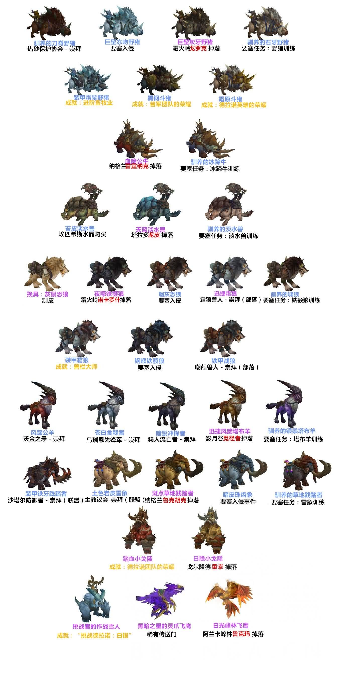 魔兽德拉诺之王坐骑汇总表,一图流,总共35只,小伙伴加油收集吧。