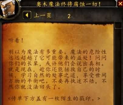 ②再看这则警告的内容,倒像是《醒世恒言》之类警醒说教之词,似乎在过去的某个时候发生过一些不好的事,而且长辈们对这些坏事知之甚详;再者,其中有夹杂着一些“自然”、“万物的平衡”之类的字句,又像是以德鲁伊为主的塞纳里奥议会的口头禅。