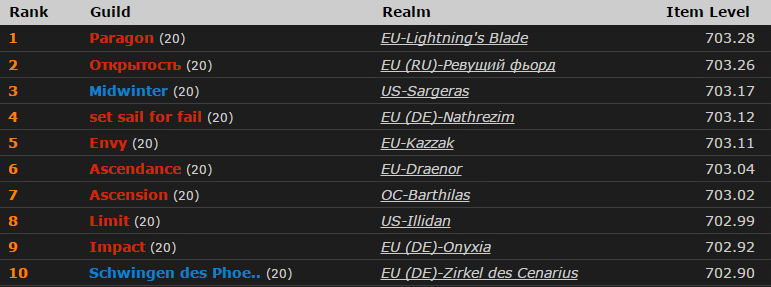 装等方面,Paragon以703.28的平均装等列世界第一,第二则是欧服俄语区的Openness,仅落后Paragon 0.02个装等,黑石版本中表现出色的Midwinter以703.17列第三。拿到黑手首杀的Method则只有702.59,暂列第49。不过装等并不能代表全部,待6.2开放第一周farm完毕后排名可能会有很大变动。