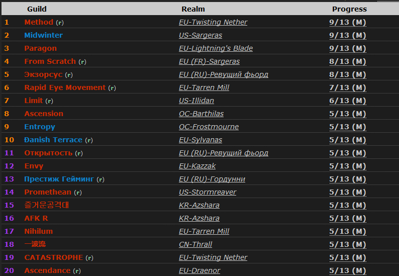 在之前卖蛇的以9M傲视群雄的时候,作为他的老牌竞争对手怕老公和Midwinter显然不会放任他一个人唱独角戏太久,在不久后纷纷也达成了9M进度,与卖蛇并驾齐驱。而对比之前第一军团比后面公会领先了4个BOSS之多的巨大优势,现在也被后面的公会拉近了,欧服公会From Scratch与Exorsus越战越勇,在终于通关血魔后连续击杀2个BOSS,以8M进度紧随第一军团其后,与第一军团仅有一个BOSS之差。欧洲军团发挥了他们PVE强服的优良传统,在前10的席位上占据了7席,简直是不给其他服务器公会活路。