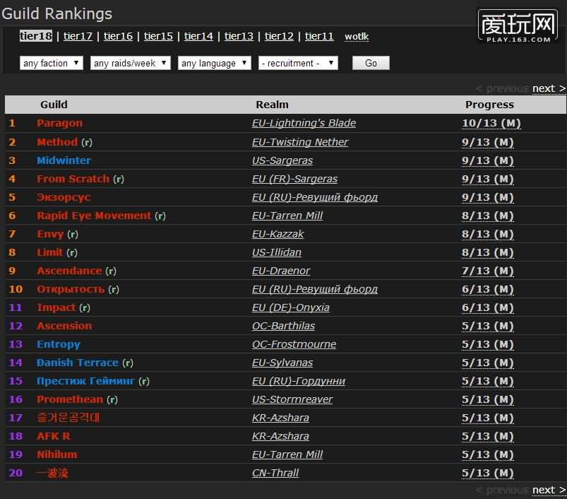 另外值得一提的是国服目前也已追上大部队,佶天鸿作为国服最先达到5/13M进度的公会暂时领先国服,无奈未被WOWPROGRESS收录,即使是第二击杀的史诗基尔罗格的一波流目前也已经排名进入了前20。而其他国服强力公会也纷纷加入到史诗地狱火堡垒的首杀争夺中,其他国服强力公会目前进度如下: