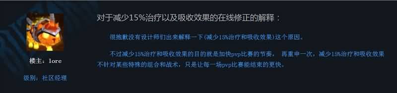 不过减少15%治疗和吸收效果的目的就是加快pvp比赛的节奏, 再重申一次,减少15%治疗和吸收效果不针对某些特殊的组合和战术,只是让每一场pvp比赛能结束的更快。