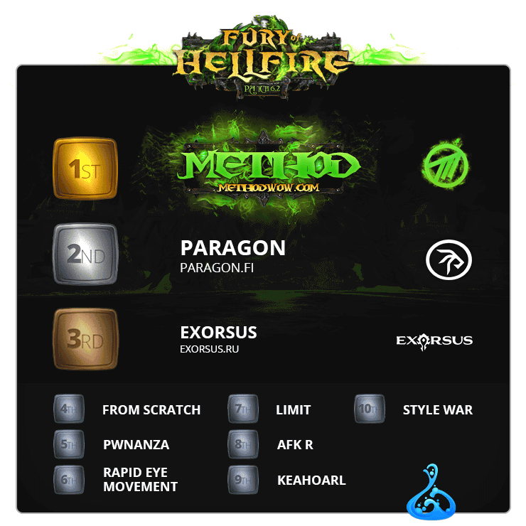 至此,史诗地狱火堡垒前10名的队伍全部产生,其中欧服包揽了前6名,美服唯一一家公会刚好卡在第7名,亚服则分列8-10名。