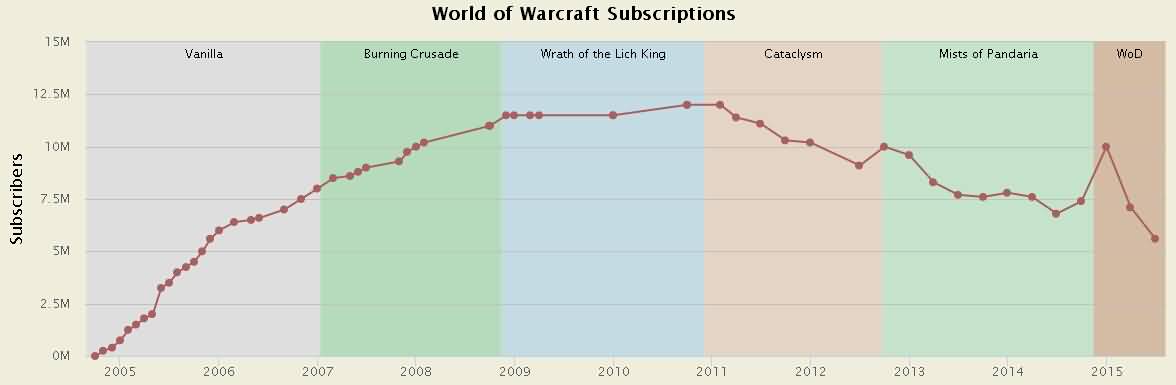 加上第一季度流失的290万付费用户,2015年上半年魔兽世界付费用户已流失440万。相比年初的1000万付费用户,累积降幅达44%!