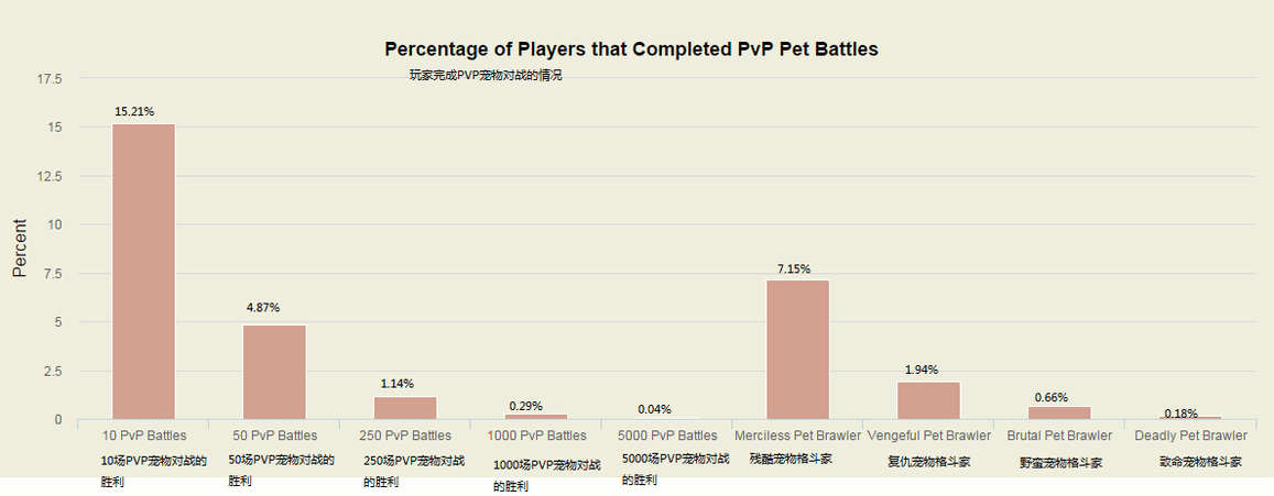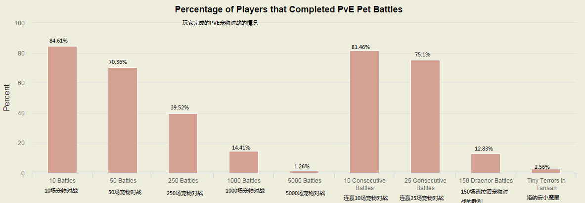 PVE宠物对战,玩家的参与度比较高,完成了50场宠物作战胜利的玩家占了7成,而完成了250场宠物作战胜利的玩家也有4成;而德拉诺之王和后续的版本中加入的宠物对战的内容,参与度比较低,仅有12.83%的玩家完成了150场德拉诺的宠物作战,可以建造3级宠物小窝。6.2中新增的成就“塔纳安小魔星”的完成率只有2.56%
